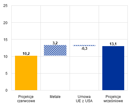 W porównaniu z projekcjami z czerwca 2025 efektywne stawki celne w Stanach Zjednoczonych na import ze strefy euro i od wszystkich partnerów handlowych są wyższe w następstwie umowy handlowej między USA a UE i innych komunikatów. W projekcjach ekspertów uwzględniono stawki celne, odroczenia i zwolnienia obowiązujące na dzień będący datą graniczną projekcji (28 sierpnia) i założono, że pozostaną one na takim samym poziomie przez cały horyzont projekcji.