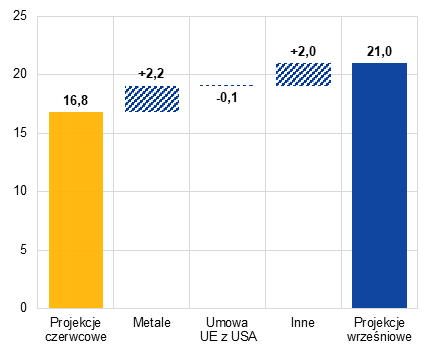 Uwagi: Pionowa linia wyznacza początek horyzontu projekcji. Rewizje na podstawie liczb niezaokrąglonych. Słupek w czerwone paski przedstawia wpływ wyników za pierwszy i drugi kwartał 2025 na wzrost w trakcie roku 2025.