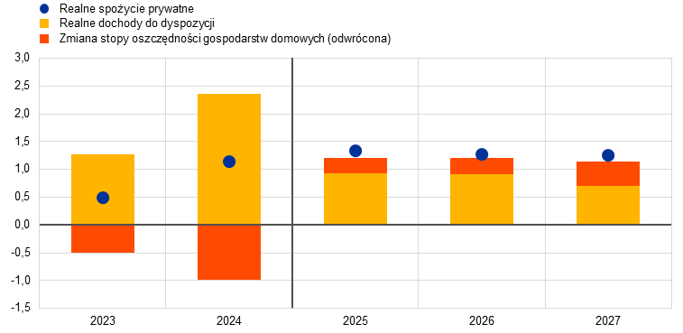Według projekcji kwartalna dynamika realnego PKB w średnim okresie zwiększy się do 0,3%. Będą ją wspierać wzrost dochodów do dyspozycji, spadek niepewności, silniejszy popyt zewnętrzny oraz bodźce fiskalne związane z obronnością i infrastrukturą. Oczekuje się, że dynamika spożycia prywatnego będzie podtrzymywana przez rosnącą siłę nabywczą gospodarstw domowych, wynikającą z umiarkowanego wzrostu płac i zatrudnienia – mimo pewnego spowolnienia na rynku pracy – oraz słabnięcia inflacji i nieznacznego obniżenia się stopy oszczędności gospodarstw domowych. Inwestycje mają w horyzoncie projekcji stopniowo rosnąć, co będzie odzwierciedlać spadek niepewności, zwiększenie wydatków na obronność i infrastrukturę, wsparcie ze środków z programu Next Generation EU (NGEU) oraz poprawę warunków popytowych zgodnie z cyklicznym ożywieniem. Jednak osłabienie popytu zewnętrznego utrzymujące się do pierwszych miesięcy 2026, uporczywe problemy związane z konkurencyjnością strefy euro, wyższe cła i silniejszy kurs walutowy prawdopodobnie doprowadzą do dalszego spadku udziałów w rynkach eksportowych, co spowolni też odbicie inwestycji przedsiębiorstw. Ogłoszone w pierwszym półroczu środki fiskalne związane z obronnością i infrastrukturą powinny w niewielkim stopniu pobudzić wzrost gospodarczy w średnim okresie. Ich łączna kontrybucja w całym horyzoncie projekcji ma wynieść 0,25 pkt proc. Ogólnie oczekuje się, że od początku 2026 kwartalna dynamika PKB będzie utrzymywać się na poziomie 0,3%. Spadek średniorocznej dynamiki realnego PKB z 1,2% w 2025 do 1,0% w 2026 będzie konsekwencją szacowanego niższego efektu przeniesienia w 2026 w następstwie oczekiwanego słabego wzrostu gospodarczego w drugiej połowie 2025 (wykres 1, część d).