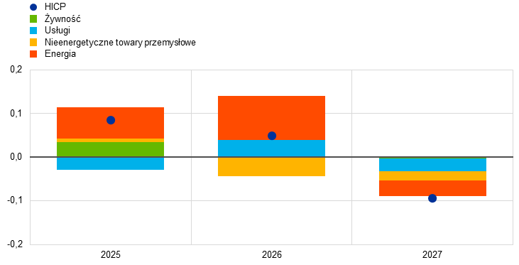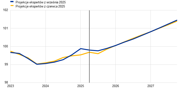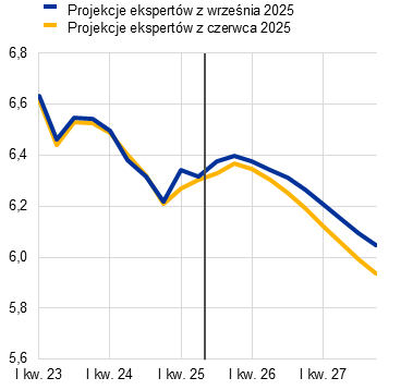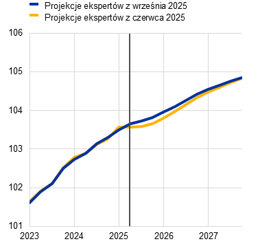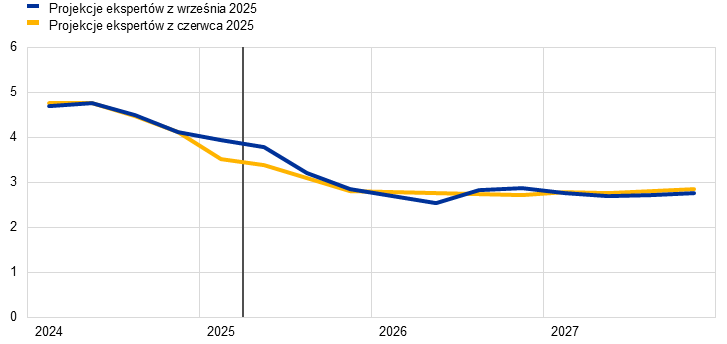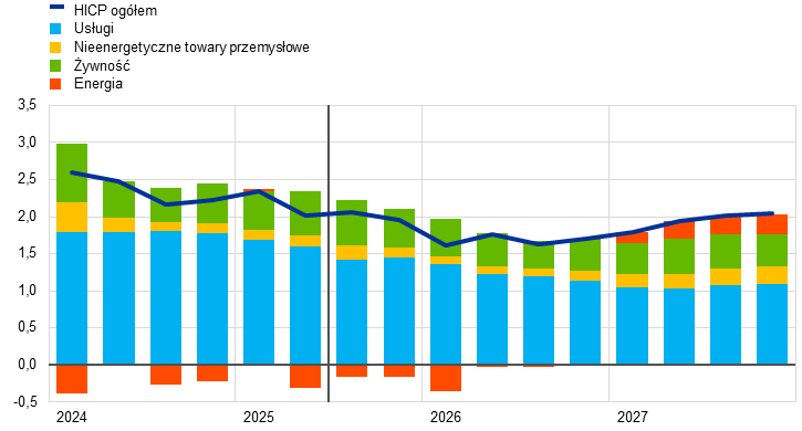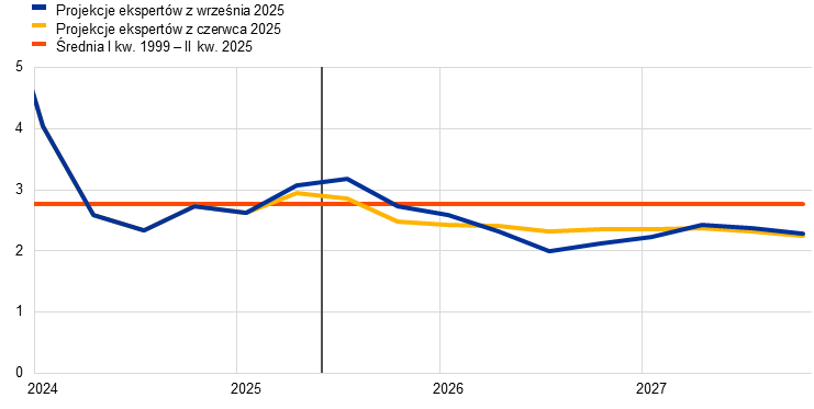 Perspektywy inflacji są spójne z jej stabilizacją na poziomie zbliżonym do średniookresowego celu wynoszącego 2%. Przewiduje się, że inflacja ogółem, mierzona zharmonizowanym wskaźnikiem cen konsumpcyjnych (HICP), do końca 2025 będzie oscylować wokół 2%, po czym spadnie do 1,7% w 2026, a następnie wzrośnie do 1,9% w 2027. Spadek w 2026 wynika z tego, że składowe nieenergetyczne mają się dalej osłabiać, podczas gdy inflacja cen energii według oczekiwań pozostanie zmienna, ale wzrośnie w horyzoncie projekcji, częściowo z powodu uruchomienia w 2027 unijnego systemu handlu uprawnieniami do emisji 2 (EU ETS 2). Oczekuje się, że początkowo inflacja cen żywności pozostanie wysoka – ponieważ oddziaływać będą opóźnione skutki wcześniejszych wzrostów cen surowców żywnościowych na świecie – ale w latach 2026 i 2027 spadnie do nieco powyżej 2%. Inflacja HICP z wyłączeniem cen energii i żywności (HICPX) ma się zmniejszać, w miarę jak presja płacowa będzie się obniżać, inflacja cen usług słabnąć, a aprecjacja euro oddziaływać w łańcuchu cenowym i ograniczać inflację cen towarów. Oczekuje się, że niższa dynamika płac, po odrobieniu wcześniejszych spadków płac realnych, w połączeniu z odbiciem dynamiki produktywności sprawią, że wzrost jednostkowych kosztów pracy znacznie spowolni. W porównaniu z projekcjami z czerwca 2025 perspektywy inflacji HICP ogółem zarówno na 2025, jak i na 2026 zrewidowano w górę o 0,1 pkt proc. Wynika to z wyższych rzeczywistych i przyjętych w założeniach cen surowców energetycznych oraz opóźnionych skutków wyższych cen surowców żywnościowych na świecie, które z nawiązką skompensowały aprecjację euro. W 2027 według przewidywań przeważą opóźnione skutki aprecjacji euro, co skutkuje rewizją w dół inflacji HICP o 0,1 pkt proc.