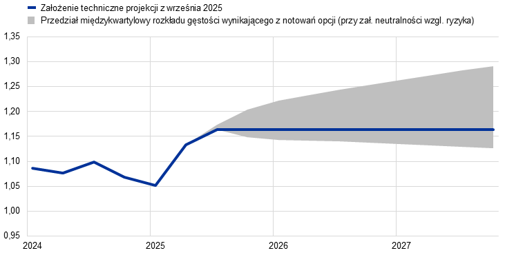 Uwagi: Wzrost oznacza aprecjację euro. 25. percentyl i 75. percentyl odnoszą się do rozkładu gęstości kursu USD/EUR wynikającego z notowań opcji (przy założeniu neutralności względem ryzyka) na 15 sierpnia 2025. Skutki makroekonomiczne podaje się jako średnie wyników uzyskanych z różnych modeli makroekonomicznych stosowanych przez ekspertów EBC i Eurosystemu.