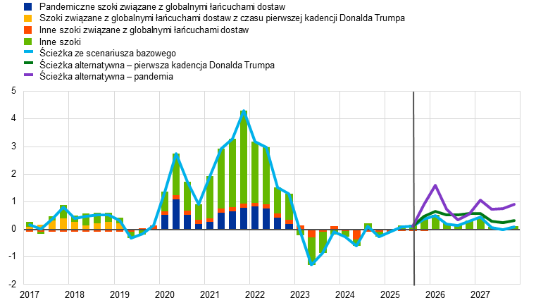 Mogą pojawić się zatory podażowe, ponieważ nowe cła, zakłócenia w handlu i podwyższona niepewność mogą skłonić przedsiębiorstwa do restrukturyzacji łańcuchów dostaw, co doprowadzi do pewnego spadku wydajności produkcji – przynajmniej przejściowo. Obecnie nie ma oznak znacznych zatorów w globalnych łańcuchach dostaw, a uzgodniona niedawno umowa handlowa między USA a UE zmniejszyła prawdopodobieństwo, że takie zakłócenia dotkną strefę euro. W związku z tym w projekcjach bazowych nie założono żadnych znacznych zatorów podażowych. Jednak z uwagi na wysokość ceł nałożonych przez USA na pewne kraje, które odgrywają kluczową rolę w globalnych łańcuchach dostaw, a także możliwość dalszej eskalacji konfliktu handlowego, nie można wykluczyć pojawienia się takich zakłóceń. Żeby ocenić to ryzyko, opracowano dwie ścieżki alternatywne wokół ścieżki wskaźnika poziomu napięć w globalnych łańcuchach dostaw (indeksu GSCPI)[17] ze scenariusza bazowego, z wykorzystaniem dużego strukturalnego bayesowskiego modelu autoregresji wektorowej (BVAR) uwzględniającego projekcje z września 2025 (wykres 19)[18]. W scenariuszu bazowym ścieżka indeksu GSCPI w horyzoncie projekcji przebiega blisko jego obecnego poziomu, co oznacza niewielki wpływ na aktywność w strefie euro. Pierwszą ścieżkę alternatywną wytyczono poprzez odniesienie do ścieżki ze scenariusza bazowego szoków związanych z globalnymi łańcuchami dostaw z okresu pierwszej kadencji Donalda Trumpa (żółte słupki na wykresie 19), zidentyfikowanych przez model BVAR. Druga ścieżka alternatywna odzwierciedla poważne zatory podażowe, odpowiadające pod względem skali szokom obserwowanym podczas pandemii COVID‑19 (niebieskie słupki na wykresie 19). To założenie jest skrajne, ponieważ prawdopodobieństwo wystąpienia takiego szoku obecnie ocenia się jako bardzo niskie.