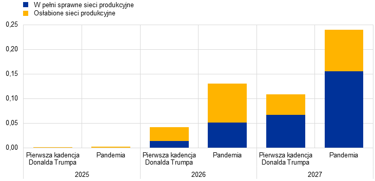 Uwagi: Żółte słupki pokazują ogólny wpływ zatorów handlowych uwzględniający oddziaływanie osłabienia sieci produkcyjnych. To oddziaływanie szacuje się za pomocą modelu obejmującego wiele krajów i sektorów przez porównanie wyników z modelu, który nie przewiduje substytucji nakładów i produkcji dóbr pośrednich w procesie wytwarzania towarów, z wynikami z modelu, który to uwzględnia. Niebieskie słupki pokazują wyniki z modelu ECB‑BASE, który pośrednio uwzględnia oddziaływanie sieci handlowych.