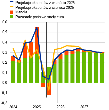 Aktywność gospodarcza w pierwszej połowie 2025 mocno się wahała z powodu ceł handlowych i związanej z nimi niepewności, przy czym początkowo przyspieszyła, zwłaszcza w Irlandii. Ustępowanie tych czynników w drugim półroczu według oczekiwań będzie powodować dalszą zmienność, przez co sygnały dotyczące dynamiki wzrostu gospodarczego w strefie euro staną się mniej jasne. Gdy pominie się zmienność spowodowaną wahaniami danych dla Irlandii, w rzeczywistości wzrost gospodarczy w pozostałej części strefy euro był stabilniejszy i według oczekiwań tak pozostanie w drugiej połowie roku. Nowa umowa handlowa między USA a UE oznacza wprawdzie wyższe cła na eksport ze strefy euro do Stanów Zjednoczonych, ale pomogła zmniejszyć niepewność co do polityki handlowej. W dalszej części horyzontu projekcji wzrost gospodarczy w strefie euro ma się zwiększyć, pod wpływem kilku czynników. Popyt wewnętrzny w strefie euro powinny wzmacniać rosnące płace realne i zatrudnienie oraz nowe wydatki publiczne na infrastrukturę i obronność, głównie w Niemczech. Ponadto na perspektywy wzrostu gospodarczego korzystnie wpływają mniej restrykcyjne warunki finansowania, wynikające głównie z ostatnich decyzji w sprawie polityki pieniężnej, oraz odbicie popytu zewnętrznego w 2027. Przewiduje się, że średnioroczna dynamika realnego PKB wyniesie 1,2% w 2025, 1,0% w 2026 i 1,3% w 2027. W porównaniu z projekcjami makroekonomicznymi ekspertów Eurosystemu z czerwca 2025 perspektywy wzrostu PKB na 2025 zrewidowano w górę o 0,3 pkt proc. Odzwierciedla to lepsze, niż oczekiwano, napływające dane i efekt przeniesienia wynikający z rewizji wcześniejszych danych. Ponieważ nie wszystkie zaskakujące dane są związane z silniejszym, niż wcześniej zakładano, początkowym przyspieszeniem aktywności, są one jedynie częściowo kompensowane w drugim półroczu. Aprecjacja euro i słabszy popyt zewnętrzny (wynikający po części z nieco wyższych, niż zakładano w projekcjach czerwcowych, stawek celnych) doprowadziły do rewizji w dół o 0,1 pkt proc. projekcji realnego PKB na 2026. Projekcja na 2027 pozostaje bez zmian[1].