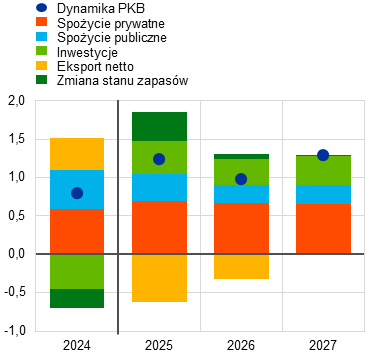 Motorem wzrostu realnego PKB powinno pozostać spożycie prywatne. W ujęciu wydatkowym (wykres 2, część a) spożycie prywatne ma w całym horyzoncie projekcji mocno rosnąć i mieć największą kontrybucję do dynamiki realnego PKB. Ponadto spożycie publiczne i inwestycje ogółem powinny w 2025−2027 co roku notować wzrost. Inwestycje prywatne mają skompensować oczekiwany nagły i ostry spadek inwestycji publicznych w 2027, wynikający z wygaśnięcia finansowania z dotacji NGEU. Z kolei eksport netto według projekcji wpłynie na zmniejszenie się dynamiki realnego PKB w 2025 i 2026 – przy czym kontrybucja importu będzie większa (odpowiednio −1,2 pkt proc. i −0,9 pkt proc.) niż eksportu (odpowiednio 0,6 pkt proc. i 0,5 pkt proc.) – ale będzie to częściowo niwelowane przez dodatnią kontrybucję zmian stanu zapasów w 2025 (wykres 2, część b). Duża zmienność tego ostatniego czynnika w 2025 jest związana z gromadzeniem i zmniejszaniem zapasów w kontekście przyspieszenia aktywności i zanikania jego wpływu.