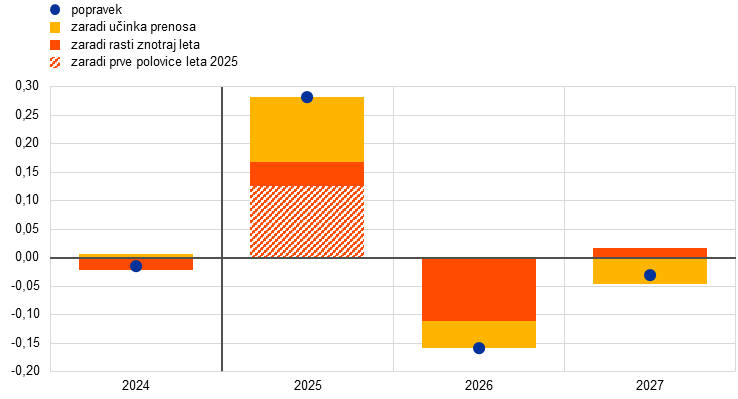 Opombe: Navpična črta označuje začetek obdobja projekcij. Popravki so izračunani na podlagi nezaokroženih števil. Črtkasti rdeči stolpec prikazuje vpliv dejanskih podatkov za prvo in drugo četrtletje 2025 na rast znotraj leta 2025.