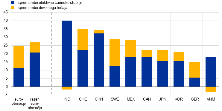 - Skupna ameriška efektivna carinska stopnja na uvoz proizvodov iz vseh trgovinskih partneric se je zvišala s 16,8% v junijskih projekcijah na 21,0% (graf A, slika b). To odraža podvojitev univerzalnih carin na jeklo in aluminij (s 25% v junijskih projekcijah na 50%) ter vključitev 407 jeklenih in aluminijevih derivatov na seznam proizvodov, za katere so uvedene carine, nove univerzalne carine na baker (50%), dvostranske trgovinske sporazume, podpisane s ključnimi trgovinskimi partnericami (npr. Evropsko unijo, Japonsko, Korejo in Vietnamom), višje vzajemne carinske stopnje, uvedene 7. avgusta za države, s katerimi ni bil dosežen trgovinski sporazum (npr. Indija in Švica), zvišanje carin na brazilski izvoz (na 50%) in kanadski izvoz (35-odstotno zvišanje dajatev na proizvode, ki niso skladni s sporazumom med ZDA, Mehiko in Kanado) ter sekundarne carine za Indijo (dodatnih 25 odstotnih točk) kot kazen za nakupe ruske nafte.