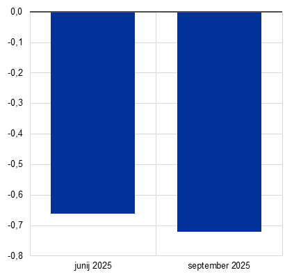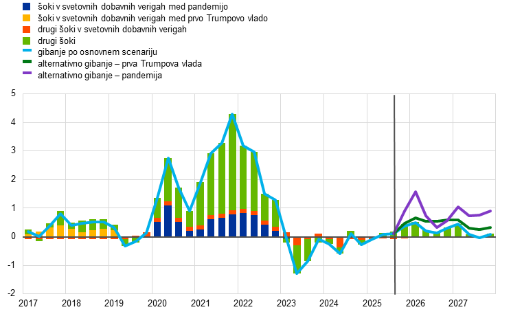 Inflacijski obeti so skladni s stabilizacijo inflacije okrog 2-odstotnega srednjeročnega cilja. Skupna inflacija, merjena s harmoniziranim indeksom cen življenjskih potrebščin (HICP), bo po projekcijah v preostanku leta 2025 ostala nespremenjena na ravni okrog 2%, nato bo leta 2026 upadla na 1.7% in leta 2027 okrevala na 1.9%. Upad v letu 2026 odraža nadaljnje postopno umirjanje drugih komponent inflacije razen energentov, medtem ko bo inflacija v skupini energentov po pričakovanjih ostala volatilna, a se bo v obdobju projekcij zviševala, deloma zaradi uvedbe 2. generacije sistema EU za trgovanje z emisijami (ETS2) v letu 2027. Inflacija v skupini hrane bo predvidoma sprva ostala povišana zaradi prelivanja zapoznelih učinkov preteklega zvišanja cen mednarodnih prehrambnih surovin, vendar se bo v letih 2026 in 2027 umirila na ravni, nekoliko višje od 2%. Inflacija brez energentov in hrane se bo po pričakovanjih znižala, ko bodo popustili plačni pritiski in se bo umirila inflacija v skupini storitev ter ko se bo apreciacija eura prelila vzdolž cenovne verige in omejila blagovno inflacijo. Nižja rast plač, ki je posledica tega, da se je preteklo zmanjšanje realnih plač že nadoknadilo, bo skupaj z okrevanjem rasti produktivnosti predvidoma privedla do precej počasnejše rasti stroškov dela na enoto proizvoda. V primerjavi z junijskimi projekcijami so bili obeti glede skupne inflacije za leti 2025 in 2026 popravljeni za 0,1 odstotne točke navzgor zaradi višjih podatkov in predpostavk o cenah energetskih surovin in zapoznelih učinkov višjih mednarodnih cen prehrambnih surovin, kar je več kot odtehtalo apreciacijo eura. Za leto 2027 naj bi prevladovali zapozneli učinki apreciacije eura, zato so bili obeti popravljeni za 0,1 odstotne točke navzdol.
