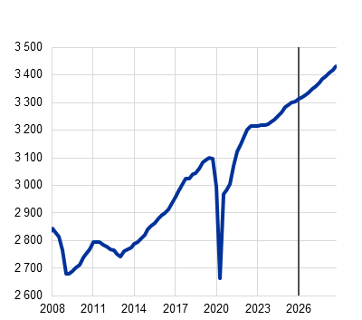 Sisenõudlust peaksid toetama jätkuvad kaitse- ja taristukulutustega seotud eelarvepoliitilised stiimulid. Kaitse- ja taristuvaldkonnas tehtavate eelarvekulutuste hinnanguline kumulatiivne kasvumõju on 0,5 protsendipunkti, sellesse panustab peamiselt Saksamaa ja see avaldub kõige tugevamalt 2026. aastal.[4] Ettevaate koostamisel on järgitud tavapärast põhimõtet, mille kohaselt võetakse arvesse ainult neid eelarvepoliitilisi meetmeid, mis on juba vastu võetud või millest on teada antud ja mis võetakse väga tõenäoliselt vastu edaspidi. Arvesse ei ole võetud valitsuste võimalikke tulevasi meetmeid kriisi majandusliku mõju piiramiseks, nagu neid, mida rakendati pärast viimast energiahindade järsku tõusu 2022. aastal.