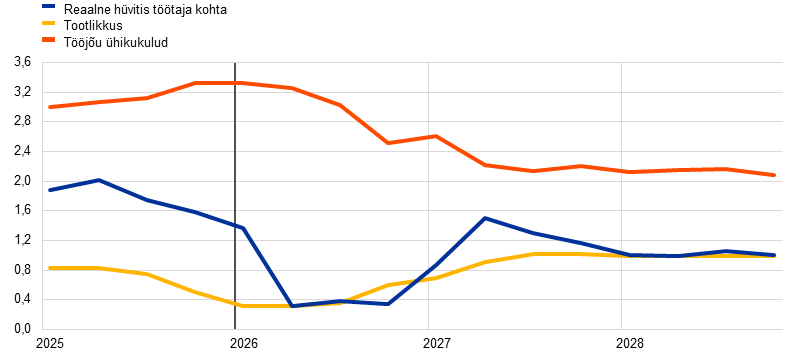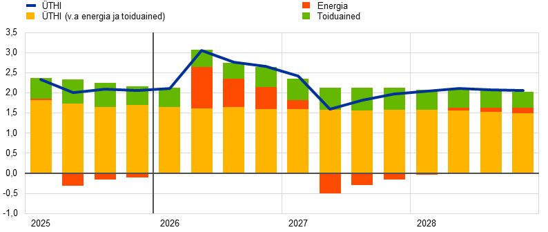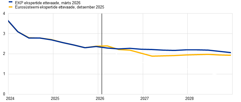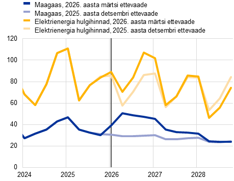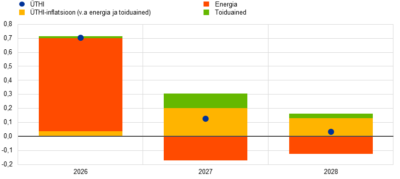 Inflatsioon (mõõdetuna ühtlustatud tarbijahinnaindeksi (ÜTHI) alusel) peaks 2026. aasta teises kvartalis kiirenema järsult 3,1%ni seoses Lähis-Ida kriisist tingitud energiahindade inflatsiooni hoogustumisega, ning aeglustuma siis kolmandas kvartalis 2,8%ni pärast energiatoorme hindade langust kooskõlas futuurihindadega. Põhiprognoosis eeldatakse, et 2027. aastal muutub energiahindade inflatsioon peamiselt energiakomponendiga seotud negatiivse baasefekti tõttu negatiivseks ja kiireneb seejärel märkimisväärselt 2028. aastal, mil ELi teise heitkogustega kauplemise süsteemi (HKS2) rakendamine peaks hoogustama koguinflatsiooni 0,2 protsendipunkti võrra. Toiduainehindade inflatsioon peaks alates 2026. aasta lõpust elavnema, kui energiahindade järsust tõusust tingitud kulusurve kandub üle toiduainete tarbijahindadesse. 2028. aastal peaks toiduainehindade inflatsioon taas aeglustuma. ÜTHI-inflatsioon (v.a energia ja toiduained) peaks aeglustuma 2,4%-lt 2025. aastal 2,1%-le 2028. aastal. Ehkki ka seda inflatsiooni mõjutab kõrgematest energiahindadest tulenev kulusurve, peaksid seda vaos hoidma tööjõukulude surve mõningane leevenemine, euro varasem kallinemine ja Hiinast pärit impordi osatähtsuse kasv. Üldjoontes eeldatakse põhiprognoosis, et ÜTHI-inflatsioon hoogustub 2025. aasta 2,1%-lt 2026. aastal 2,6%-le, aeglustub siis 2027. aastal 2,0%-le ja kerkib 2028. aastal 2,1%-le. Palgakasv lähiaastatel pidurdub, ehkki aeglasemas tempos, kui varasemates prognoosides eeldati. Selle põhjuseks on energiahinnašokiga seotud inflatsiooni kompenseerivate meetmete mõju. 2025. aasta detsembri ettevaatega võrreldes on ÜTHI-koguinflatsiooni väljavaadet 2026. aastaks peamiselt energiakomponendi tõttu 0,7 protsendipunkti võrra ülespoole korrigeeritud. 2027. ja 2028. aastaks on seda vastavalt 0,2 protsendipunkti ja 0,1 protsendipunkti võrra ülespoole korrigeeritud, arvestades kõrgematest energiahindadest tingitud kulusurve mõju ÜTHI-le (v.a energia ja toiduained). Energiakomponendi prognoosi on samal ajal mõnevõrra allapoole korrigeeritud.