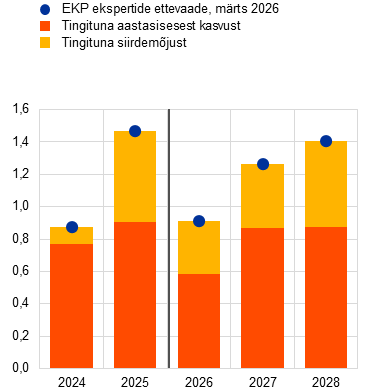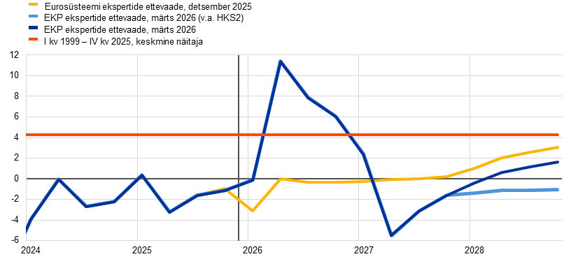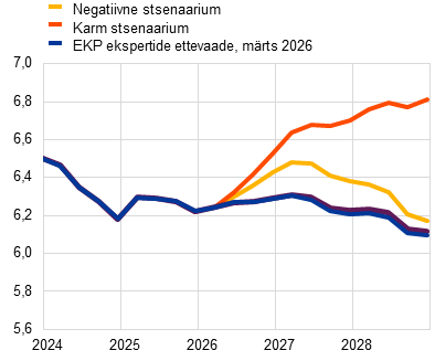Kooskõlas eurosüsteemi ekspertide detsembri ettevaatega kasvas euroala majandus möödunud aasta lõpuks 0,2% ning seda toetas tarbimise ja valitsussektori investeeringute kasv. Lühiajalised näitajad osutasid positiivse kasvudünaamika jätkumisele ka 2026. aasta esimesel kahel kuul, kuid sõda Lähis-Idas on kaasa toonud lühiajalise kasvuväljavaate allapoole korrigeerimise, kuna energiahindade šokid ja ebakindluse süvenemine pärsivad tõenäoliselt tarbimist ja investeeringuid. Tingimusel, et energiahinnad hakkavad suhteliselt kiiresti langema, nagu eeldavad energiatoorme futuuriturud, ja samamoodi taandub ebakindlus, peaks kasvu aeglustumine olema ajutine. Keskpikas perspektiivis peaks euroala majanduskasvu peamiseks tõukejõuks jääma sisenõudlus, mida toetavad vastupidav tööturg ning valitsussektorite taristu- ja kaitsekulutused, eriti Saksamaal. Väliskeskkonnas peaks ekspordikasv paraneva välisnõudluse toel hoogustuma, kuid euroala üleilmsed turuosad vähenevad tõenäoliselt veelgi, arvestades püsivaid konkurentsivõime probleeme (sealhulgas mõningad struktuurset laadi probleemid), ja hoolimata asjaolust, et USAsse suunduva ekspordi tollid on detsembri ettevaatega võrreldes mõnevõrra madalamad. Ettevaate põhiprognoosi kohaselt on SKP aastane reaalkasv 2026. aastal 0,9%, 2027. aastal 1,3% ja 2028. aastal 1,4%. 2025. aasta detsembri ettevaatega võrreldes on SKP kasvu prognoosi korrigeeritud 2026. aastaks 0,3 protsendipunkti võrra ja 2027. aastaks 0,1 protsendipunkti võrra allapoole tingituna sõja eskaleerumisest Lähis-Idas. 2028. aasta prognoos ei ole muutunud.