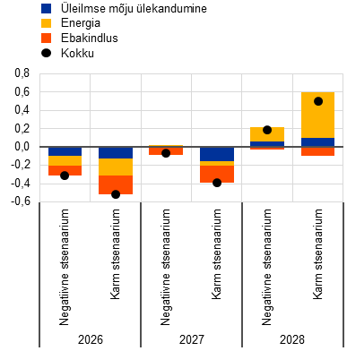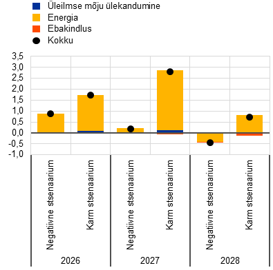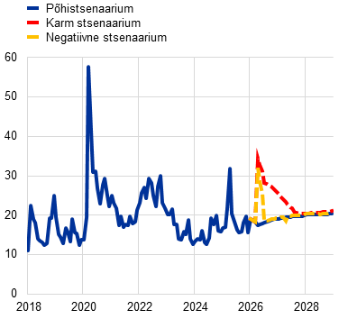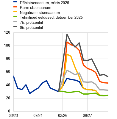 Prognoosid, mis tuginevad tehnilistele eeldustele seisuga 4. märts (ning hõlmavad kolme tööpäeva jooksul pärast Lähis-Ida sõja algust laekunud teavet), kajastavad soodsamat väljavaadet. Nende kohaselt peaksid nafta- ja gaasihind kerkima 2026. aasta teises kvartalis maksimaalselt vastavalt 79 USA dollarini barreli kohta ja 48 euroni MWh kohta.[2] Selle prognoosi kohaselt oleks inflatsiooninäitaja 2026. aastal 0,3 protsendipunkti võrra ning 2027. ja 2028. aastal 0,1 protsendipunkti võrra lõplikus põhistsenaariumis esitatust madalam, ent kasv oleks ettevaateperioodi igal aastal 0,1 protsendipunkti võrra kiirem.
