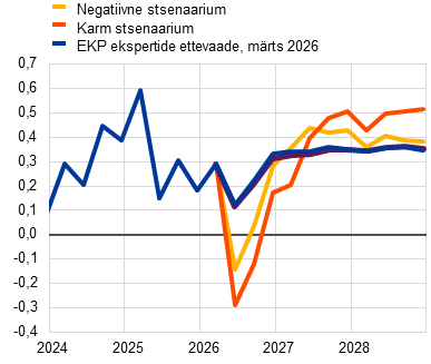 • Ekspordikasv püsib eelduste kohaselt tagasihoidlik, sest euroala jätkuvad konkurentsivõime probleemid, USA tollimaksud ja euro varasem kallinemine pärsivad endiselt eksporditegevust. Lähis-Idas toimuval sõjal on ekspordikasvule eelduste kohaselt suhteliselt leebe mõju ja lühiajaliselt peaksid seda toetama peamiste kaubanduspartnerite mõnevõrra paremad majandustulemused ja madalamatest tollimaksudest lähtuv kasvu mõõdukalt kiirendav mõju (vt infokast 1). Sellegipoolest kahaneb euroala ekspordi turuosa eelduste kohaselt veelgi. Kokkuvõttes avaldab netoeksport SKP reaalkasvule 2026. aastal tõenäoliselt mõningast negatiivset mõju, kuid 2027. aastal muutub see vähesel määral positiivseks ja püsib 2028. aastal üldjoontes neutraalne.
