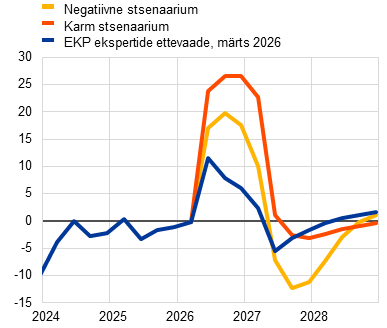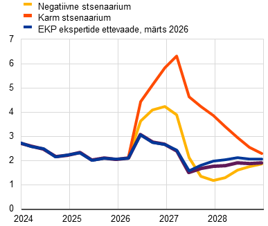 Lisaks põhiprognoosile on eksperdid koostanud ka alternatiivsed hüpoteetilised stsenaariumid. Need sisaldavad erinevaid eeldusi energiahinnašoki ulatuse ja püsivuse kohta ning käsitlevad selle mõju rahvusvahelisele keskkonnale ja ebakindlusele ning kaudseid ja teiseseid tagajärgi inflatsioonile. Stsenaariumid pakuvad illustreerivaid näiteid energiatoorme hindade alternatiivsetest arengusuundadest ja nende mõju avaldumisest euroala majanduses. EKP eksperdid ei omista alternatiivsetele stsenaariumitele mingit tõenäosust – nende eesmärk on pigem rõhutada konflikti mõjuga seotud peamisi ebakindlustegureid. Nagu eurosüsteemi ekspertide ettevaates tavapärane, kajastavad stsenaariumid mõju euroala majandusele juhul, kui põhiprognoosis eeldatust ulatuslikumaid raha- või eelarvepoliitikameetmeid ei võeta. Negatiivne stsenaarium hõlmab põhistsenaariumiga võrreldes tugevamat kaudset ja teisest mõju, et kajastada võimalikku mittelineaarsust algse energiahinnašoki mõju kandumisel teistele hindadele majanduses tervikuna. Selles eeldatakse energiahindade palju järsemat tõusu, ebakindluse süvenemist ja ulatuslikumat ebasoodsat rahvusvahelist siirdemõju (nt välisnõudluse vähenemine). Nafta- ja gaasihinnad peaksid kerkima 2026. aasta teises kvartalis kerkima rekordiliselt kõrgele tasemele ehk vastavalt 119 USA dollarini barreli kohta ja 87 euroni MWh kohta, enne kui lähenevad 2027. aasta kolmandaks kvartaliks põhiprognoosi eeldustele. Põhiprognoosiga võrreldes peaks inflatsioon olema negatiivses stsenaariumis 2026. ja 2027. aastal vastavalt 0,9 protsendipunkti ja 0,1 protsendipunkti võrra kiirem, kuid 2028. aastal 0,5 protsendipunkti võrra aeglasem. Viimase põhjuseks on energiahindade kiirest normaliseerumisest tulenev inflatsioonitempo pidurdumine kõnealusel aastal. Majanduskasv seevastu oleks 2026. ja 2027. aastal põhiprognoosiga võrreldes aeglasem ning 2028. aastal kiirem. Negatiivse stsenaariumiga võrreldes eeldatakse karmis stsenaariumis tugevamat ja püsivamat energiahindade šokki, suuremat ebakindlust ning veelgi ulatuslikumat kaudset ja teisest mõju. Naftahind peaks kerkima 2026. aasta teises kvartalis rekordiliselt kõrge 145 USA dollarini barreli kohta ja gaasihind 106 euroni MWh kohta. Pärast seda peaksid need hinnad tunduvalt aeglasemas tempos langema ja püsima kogu ülejäänud ettevaateperioodi jooksul nii põhiprognoosi kui ka negatiivse stsenaariumi eeldustest märkimisväärselt kõrgemad. Põhistsenaariumiga võrreldes oleks koguinflatsioon ettevaateperioodil märkimisväärselt ja püsivalt kiirem (1,8 protsendipunkti võrra 2026. aastal, 2,8 protsendipunkti võrra 2027. aastal ja 0,7 protsendipunkti võrra 2028. aastal). 2028. aasta inflatsiooniprognooside märkimisväärne erinevus negatiivses stsenaariumis (1,6%) ja karmis stsenaariumis (2,8%), nagu need on esitatud tabelis 1, rõhutab otsustavat rolli, mida konflikti kulgemine, energiatarnete häired ja šoki tagajärgede leviku haare kannavad keskpika perioodi inflatsioonile avalduva mõju kujunemisel. Majanduskasv oleks 2026.–2027. aastal 0,4–0,5 protsendipunkti võrra väiksem ja ületaks siis 2028. aastal 0,5 protsendipunkti võrra põhiprognoosis eeldatud taset. Kasvu hoogustumine ettevaateperioodi lõpu poole kajastab tulude ja nõudluse eeldatavat suurenemist, mis tuleneb palkade tõusureaktsioonist inflatsiooni kiirenemise järel eelnenud aastatel.