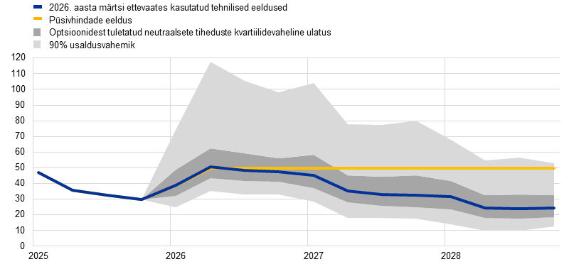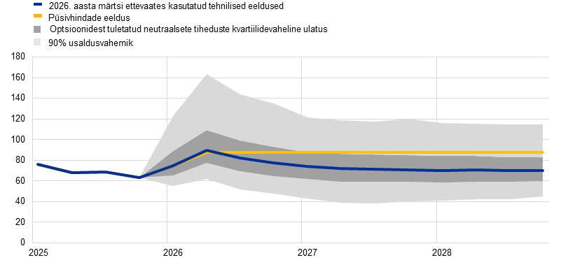1. Tehnilised eeldused on koostatud seisuga 11. märts 2026 ehk kaks päeva enne ettevaate valmimist. See on ebatavaliselt lähedal EKP nõukogu rahapoliitikaistungile, ent on tingitud erakordsetest geopoliitilistest suundumustest ja vajadusest võtta ettevaates arvesse teavet kiiresti muutuva olukorra kohta. Need eeldused põhinevad andmete esitamise kuupäevale eelnenud kolme päeva turuandmete keskmisel. See on kitsam ajavahemik kui kümme päeva, mida ekspertide ettevaates tavaliselt kasutatakse, mis tähendab, et arvesse on võetud üksnes pärast Lähis-Idas sõja puhkemist laekunud andmeid. Rahvusvahelist keskkonda käsitleva prognoosi koostamine jõudis lõpule 11. märtsil ja euroala käsitlev ettevaade on koostatud seisuga 13. märts 2026. Kuna ettevaate lõplikuks kokkupanekuks jäi piiratud aeg, ei olnud võimalik koostada mõningaid ettevaates tavaliselt esitatavaid üksikasjalikke muutujaid.