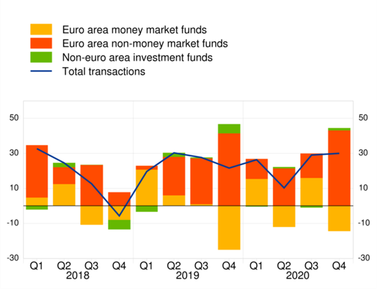 The annual growth rate of euro area money market fund shares held by insurance corporations was 4.1% in the fourth quarter of 2020, with net sales in the quarter amounting to €14 billion. As regards holdings of euro area non-money market fund shares, the annual growth rate was 4.3%, with quarterly net purchases amounting to €43 billion. For investment fund shares issued by non-euro area residents, the annual growth rate was 1.2%, with quarterly net purchases of €1 billion.