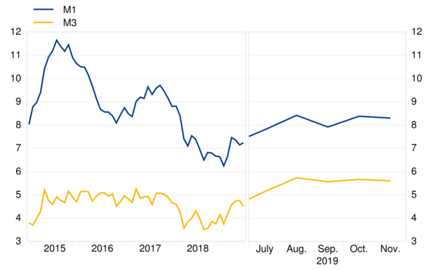 The annual growth rate of the broad monetary aggregate M3 stood at 5.6% in November 2019, after 5.7% in October, averaging 5.6% in the three months up to November. The components of M3 showed the following developments. The annual growth rate of the narrower aggregate M1, which comprises currency in circulation and overnight deposits, stood at 8.3% in November, compared with 8.4% in October. The annual growth rate of short-term deposits other than overnight deposits (M2-M1) decreased to 0.3% in November from 0.5% in October. The annual growth rate of marketable instruments (M3-M2) was -0.7% in November, compared with -1.4% in October.