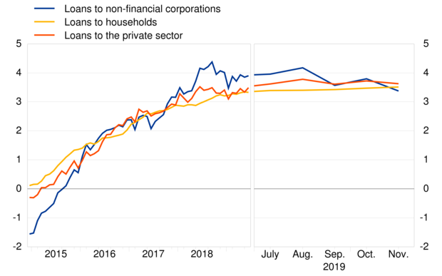 As regards the dynamics of credit, the annual growth rate of total credit to euro area residents stood at 2.0% in November 2019, unchanged from the previous month. The annual growth rate of credit to general government stood at -1.4% in November, and the annual growth rate of credit to the private sector stood at 3.2% in November, both unchanged from the previous month.The annual growth rate of adjusted loans to the private sector (i.e. adjusted for loan sales, securitisation and notional cash pooling) stood at 3.6% in November, compared with 3.7% in October. Among the borrowing sectors, the annual growth rate of adjusted loans to households stood at 3.5% in November, unchanged from the previous month, while the annual growth rate of adjusted loans to non-financial corporations decreased to 3.4% in November from 3.8% in October.