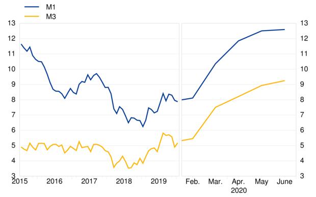 The annual growth rate of the broad monetary aggregate M3 increased to 9.2% in June 2020 from 8.9% in May, averaging 8.8% in the three months up to June. The components of M3 showed the following developments. The annual growth rate of the narrower aggregate M1, which comprises currency in circulation and overnight deposits, stood at 12.6% in June, compared with 12.5% in May. The annual growth rate of short-term deposits other than overnight deposits (M2-M1) stood at 0.7% in June, unchanged from the previous month. The annual growth rate of marketable instruments (M3-M2) increased to 10.1% in June from 5.7% in May.