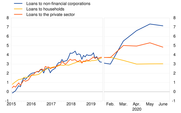 As regards the dynamics of credit, the annual growth rate of total credit to euro area residents increased to 7.0% in June 2020 from 6.2% in the previous month. The annual growth rate of credit to general government increased to 13.6% in June from 9.8% in May, while the annual growth rate of credit to the private sector stood at 4.8% in June, compared with 4.9% in May.The annual growth rate of adjusted loans to the private sector (i.e. adjusted for loan sales, securitisation and notional cash pooling) decreased to 4.8% in June from 5.3% in May. Among the borrowing sectors, the annual growth rate of adjusted loans to households stood at 3.0% in June, unchanged from the previous month, while the annual growth rate of adjusted loans to non-financial corporations decreased to 7.1% in June from 7.3% in May.