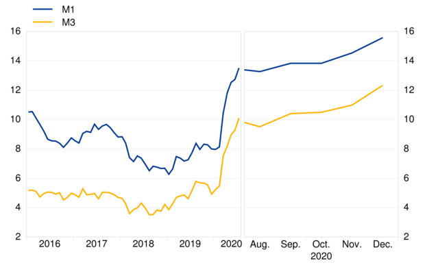 - Annual growth rate of broad monetary aggregate M3 increased to 12.3% in December 2020 from 11.0% in November