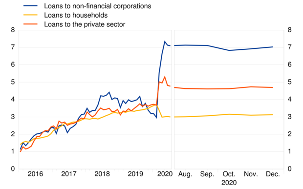 As regards the dynamics of credit, the annual growth rate of total credit to euro area residents increased to 9.6% in December 2020 from 9.1% in the previous month. The annual growth rate of credit to general government increased to 22.2% in December from 21.2% in November, while the annual growth rate of credit to the private sector increased to 5.3% in December from 5.0% in November.