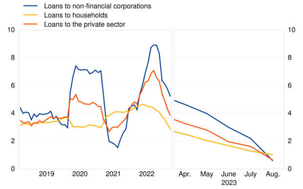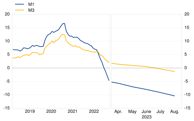 - Annual growth rate of broad monetary aggregate M3 was -1.3% in August 2023, compared with -0.4% in July