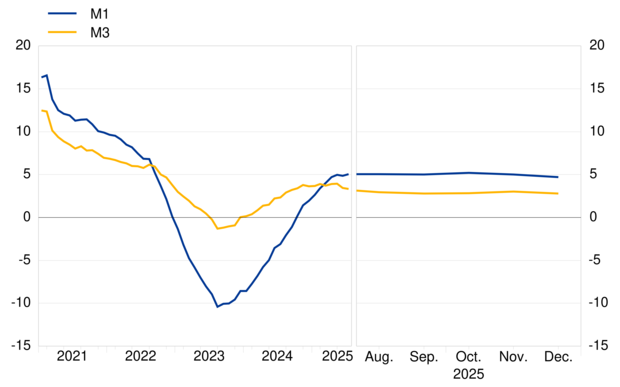 The annual growth rate of M3 in December 2025, as a reflection of changes in the items on the monetary financial institution (MFI) consolidated balance sheet other than M3 (counterparts of M3), can be broken down as follows: claims on the private sector contributed 2.8 percentage points (down from 3.1 percentage points in November), net external assets contributed 1.7 percentage points (as in the previous month), claims on general government contributed 0.3 percentage points (as in the previous month), longer-term liabilities contributed -1.1 percentage points (up from -1.2 percentage points), and the remaining counterparts of M3 contributed -0.9 percentage points (as in the previous month).