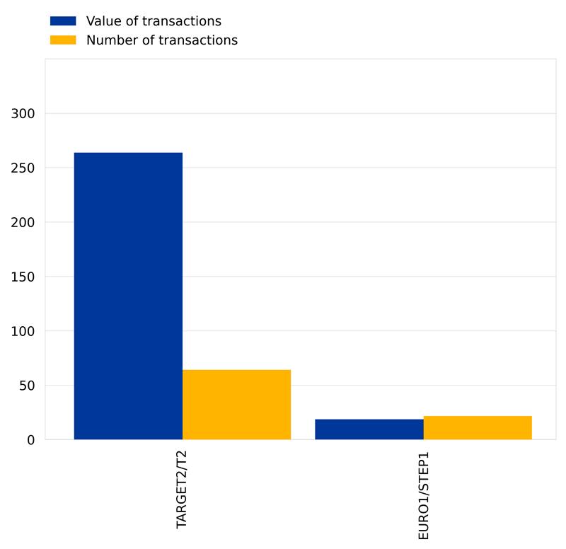 In the first half of 2023, large-value payment systems settled 85.9 million payments with a total value of €282.7 trillion in euro payments, with TARGET2/T2 and EURO1/STEP1 being the two main systems.[9]