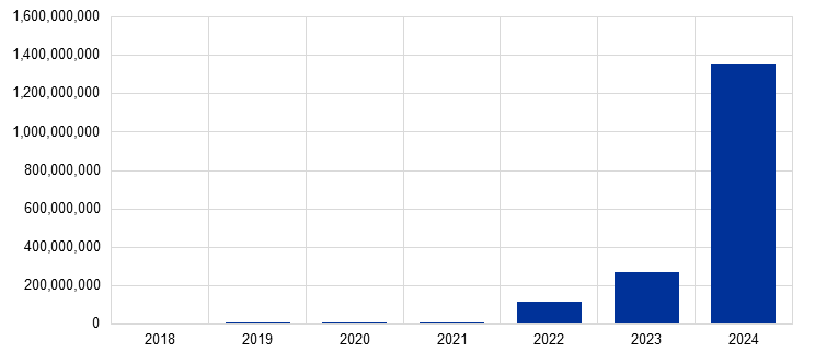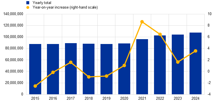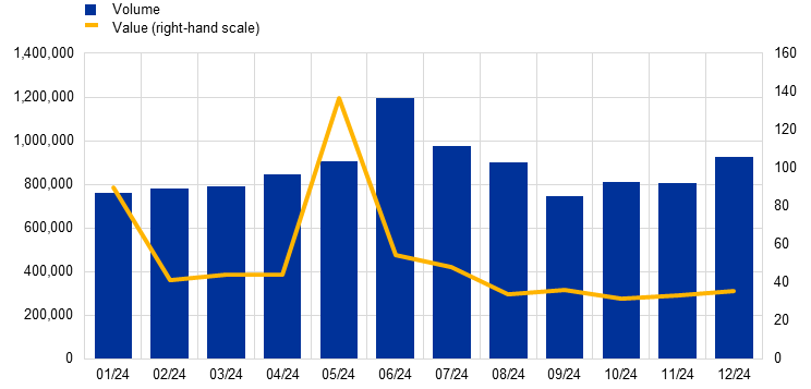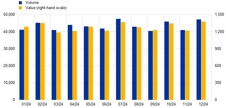 In early 2025 the Eurosystem made an adjustment to the T2 statistical reporting framework that excludes additional liquidity transfers between the CLM component and the RTGS service from T2 traffic statistics.[1] To ensure comparability with 2024, in this report T2 traffic statistics related to 2023 have also been revised.
