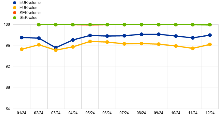 The multi-currency feature of TARGET Services allows settlement services to be provided in currencies other than the euro. Until 2024 this feature was used only in T2S for settlement of securities in Danish kroner. Sweden became the first non-euro area country to join TIPS with its national currency in 2024 and is already a major driver of TIPS traffic, accounting for more than half of TIPS’ volume in 2024.