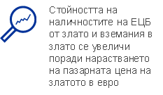 Равностойността в евро на наличностите на ЕЦБ от злато и вземания в злато се увеличи през 2022 г. с 1,6 млрд. евро до 27,7 млрд. евро (Графика 4) поради нарастване на пазарната цена на златото в евро, като размерът на наличностите в унции чисто злато остана непроменен. Това нарастване доведе и до увеличение в същия размер в сметките на ЕЦБ за преоценка на златото (вижте раздел 1.3.2 „Финансови ресурси“).