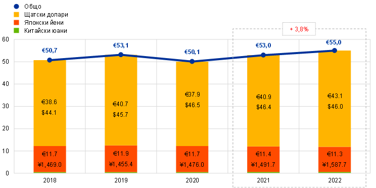 Щатските долари продължиха да са главният компонент на чуждестранните валутни резерви на ЕЦБ с приблизителен дял от 78% в техния общ размер в края на 2022 г.