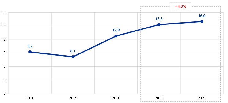 През 2022 г. общата равностойност в евро на чуждестранните резервни активи на ЕЦБ, които се състоят от злато, специални права на тираж, щатски долари, японски йени и китайски юани, се увеличи с 4,1 млрд. евро до 84,5 млрд. евро.