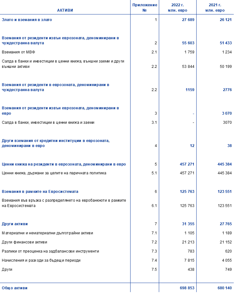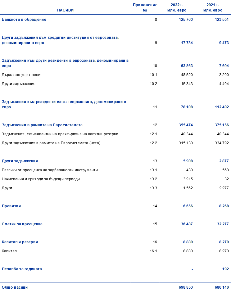 През 2022 г. балансовото число на ЕЦБ е нараснало с 18,7 млрд. евро до 698,9 млрд. евро, главно поради нейния дял в покупките на ценни книжа по PEPP и по APP. Тези покупки доведоха до увеличение на ценните книжа, държани за целите на паричната политика, а паричният им сетълмент посредством сметки в TARGET2 доведе до съответно нарастване на задълженията в рамките на Евросистемата. Това увеличение на задълженията в рамките на Евросистемата беше неутрализирано изцяло от входящи парични потоци в резултат от по-големи депозити на резиденти на еврозоната при ЕЦБ, което същевременно доведе до нарастване на други пасиви.