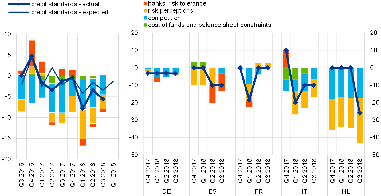 Credit standards on loans to enterprises eased in all of the largest euro area countries in the third quarter of 2018, with the exception of France, where they remained unchanged. In line with this development, competition contributed to an easing of credit standards in all countries except France. In addition, lower risk perceptions relating to the economic situation and borrowers’ creditworthiness had an easing impact in Italy and the Netherlands, a broadly neutral impact in Germany and Spain, and a slight tightening impact in France. Banks in Spain also reported that their tolerance of risk had contributed to a net easing of credit standards on loans to enterprises in the third quarter. Finally, banks’ cost of funds and balance sheet constraints had a neutral effect in all major euro area countries.