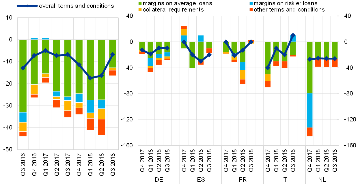 Looking at the largest euro area countries, overall terms and conditions on new loans or credit lines to enterprises eased in Germany, Spain and the Netherlands. This was mainly related to a further narrowing of margins on average loans. In contrast, overall terms and conditions remained unchanged in France, and they were tightened in Italy (mainly as a result of a widening of margins on riskier loans).