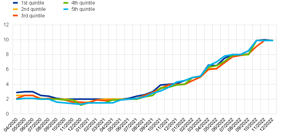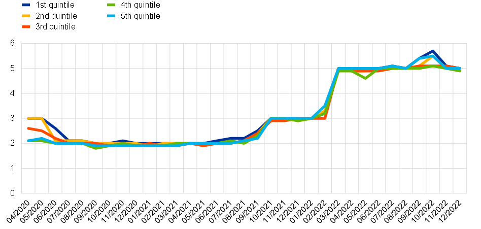 Notes: Weighted estimates. The numbers are based on respondent-specific probability distributions derived from the probabilistic bin question on inflation expectations. Note that the total number of bins increased from eight to ten as of July 2022 (survey wave 31). Implied inflation uncertainty is computed as the interquartile range from the respondent-specific subjective distribution.