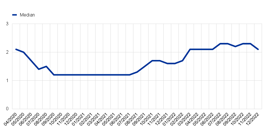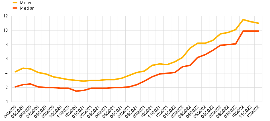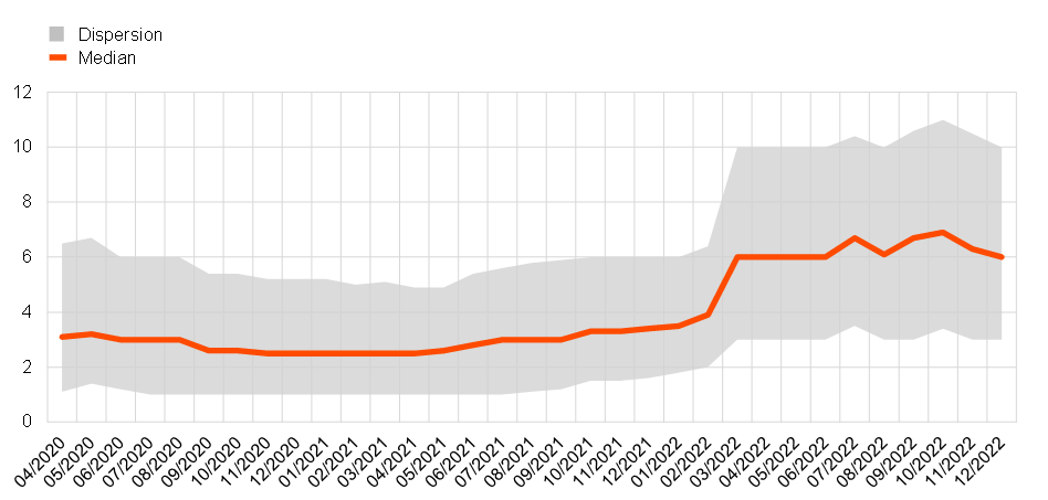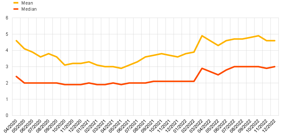 Notes: Weighted estimates. The numbers are based on respondent-specific probability distributions derived from the probabilistic bin question on inflation expectations. Note that the total number of bins increased from eight to ten as of July 2022 (survey wave 31). Median inflation expectations are computed as the sample median of the implied mean from the respondent-specific subjective distribution. The dispersion indicates the sample disagreement about inflation expectations. It is computed as the interquartile range between the 75th and 25th percentile of the implied mean inflation expectations.