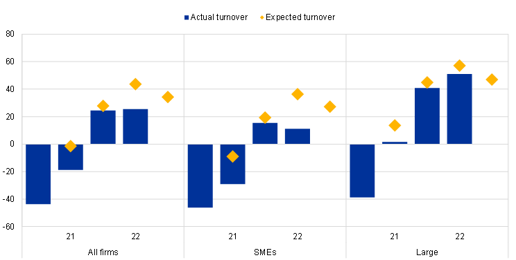 Euro area enterprises continued to signal a recovery in business activity over the past six months (with 25% in net terms[2] reporting increases in turnover) (see Chart 1 in section 2). This is the third round in which there has been an improvement since the historical low reached after the outbreak of the coronavirus (COVID-19) pandemic. Across firm sizes, it appears that large companies are still experiencing a faster rebound than small and medium-sized enterprises (SMEs).