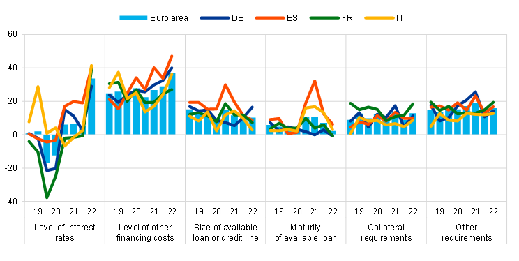 A very high percentage of firms reported increases in bank interest rates, with similar developments across firm sizes and countries (up from 5% to 34%) (see Chart 15 in section 4). No comparable percentage had been observed in the survey replies to questions about price terms and conditions for bank financing since 2012. The very high percentage figure is consistent with the recent net widening of margins applied to bank loans, which was also signalled by banks in the April 2022 bank lending survey (BLS).[4]